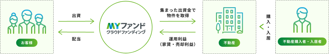 Myファンド クラウドファンディングなら「まとまった資金不要」「不動産投資の知識不要」「不動産管理の手間不要」で、 お手軽投資が可能です。運用不動産の選定・取得・運用・売却は全て不動産のプロである当社が行います。
